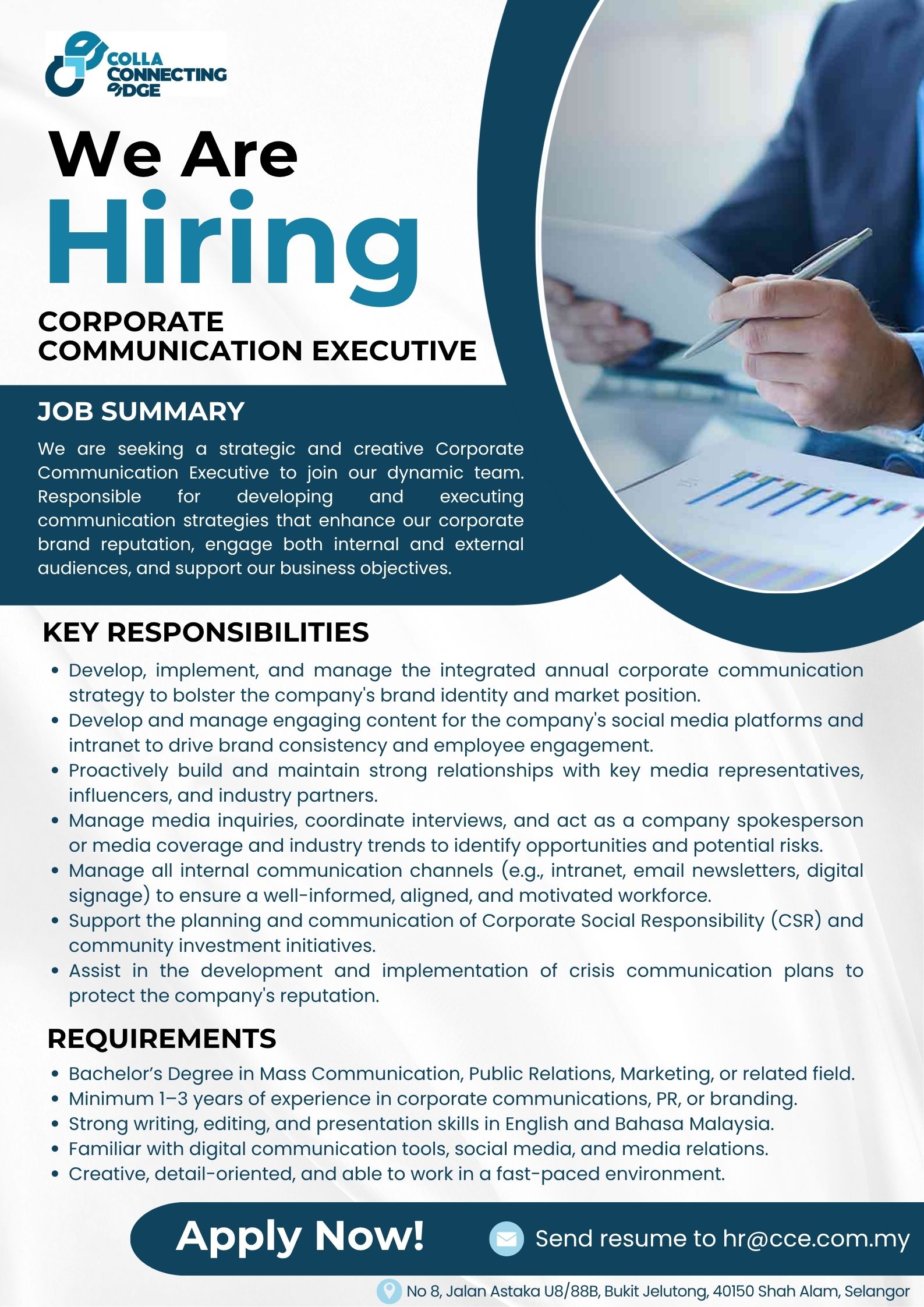 We are seeking a strategic and creative Corporate Communication Executive to join our dynamic team. Responsible for developing and executing communication strategies that enhance our corporate brand reputation, engage both internal and external audiences, and support our business objectives.